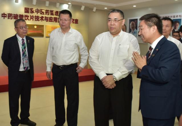 圖說:中智藥業(yè)總工程師成金樂教授向澳門特首崔世安(右二)、中山市長焦蘭生(右三)一行介紹新型中藥破壁飲片。