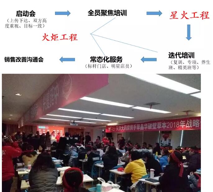 在具體實踐中,草晶華透過“兩會兩工程”實現(xiàn)營銷在合作連鎖的落地——“兩會”,一是指啟動會,意在與合作藥店實現(xiàn)目標的共同建立,透過項目開展的意義與儀式感提升團隊的認知及行動力;二是指銷售改善會,每月一次,雙方關(guān)鍵團隊成員就合作中的問題與亮點深度交流,定出問題改善策略與動作,快速糾偏。“兩工程”,一是指火炬工程,強調(diào)知識的傳播,要求培訓(xùn)體系(三級培訓(xùn),分層級迭代打造員工專業(yè)化,形式包括全員基礎(chǔ)培訓(xùn)、區(qū)域復(fù)訓(xùn)、門店貼柜培訓(xùn)、精英班、養(yǎng)生專家班等)按月、按季、按區(qū)域開展;二是指星火工程,強調(diào)技能的轉(zhuǎn)化,即總部動銷師與屬地動銷師要到門店手把手教會店員銷售,同時實現(xiàn)門店每天超出之前5至10倍的銷售增長。