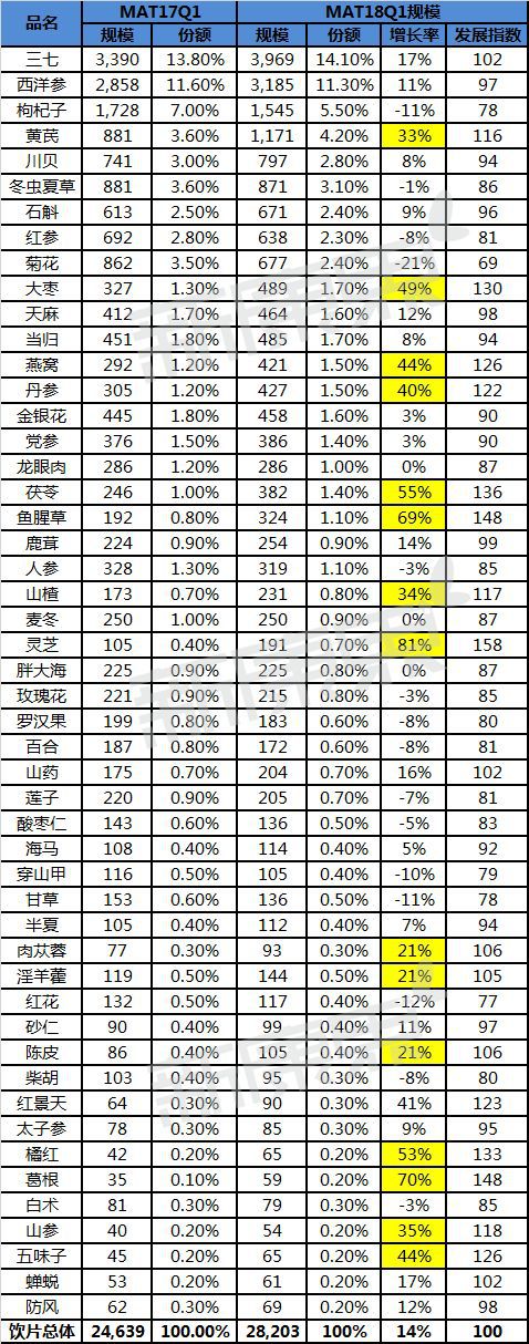 據中康CMH監(jiān)測的最新數據顯示,2018年第一季度,中藥飲片銷售前五的品種為三七、西洋參、枸杞子、黃芪、川貝,其中三七、西洋參、黃芪三個品種的銷售額快速增長,均高達兩位數。