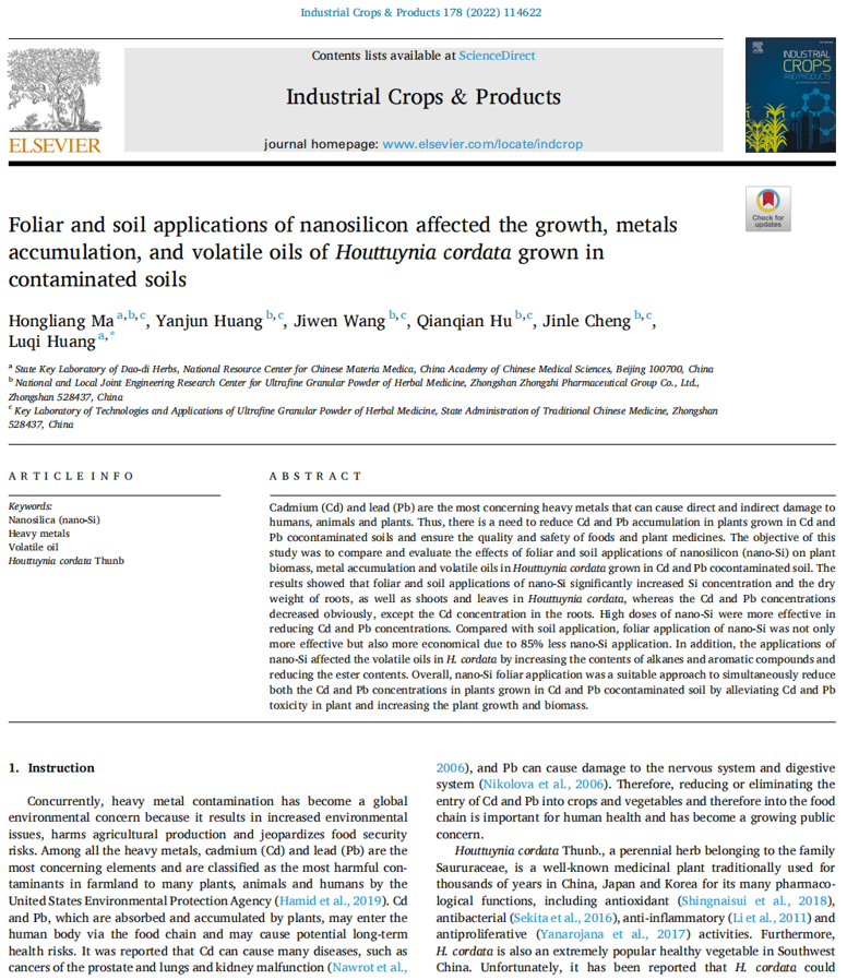 近日,草晶華中藥資源開發(fā)與研究中心馬宏亮博士研究團(tuán)隊(duì)與中國中醫(yī)科學(xué)院黃璐琦院士研究團(tuán)隊(duì)合作項(xiàng)目研究成果科研論文《Foliar and soil applications of nanosilicon affected the growth, metals accumulation, and volatile oils of Houttuynia cordata grown in contaminated soils》,在國際著名學(xué)術(shù)期刊IndustrialCrops & Products上發(fā)表,標(biāo)志著草晶華魚腥草生產(chǎn)及質(zhì)量控制水平獲得國際認(rèn)可!