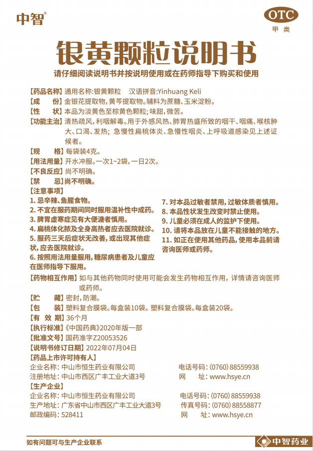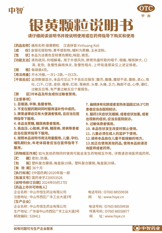 根據(jù)《國家藥監(jiān)局關(guān)于修訂復(fù)方感冒靈制劑和銀黃口服制劑說明書的公告(2024年第81號)》的要求,我司對銀黃顆粒(國藥準(zhǔn)字Z20053526)說明書進行了修訂和備案,并從2409310A批銀黃顆粒啟用了修訂后的說明書。同時按照最新國家藥監(jiān)局對說明書修訂的要求,為了使該品種使用者充分知悉說明書的修訂情況(內(nèi)容詳見說明書修訂前后),我司將修訂情況以告知函的形式將修訂情況予以告知。說明書修訂后的內(nèi)容對我司在市場上流通的銀黃顆粒適用,請在使用前仔細閱讀,按說明使用或在藥師或醫(yī)師的指導(dǎo)下使用。