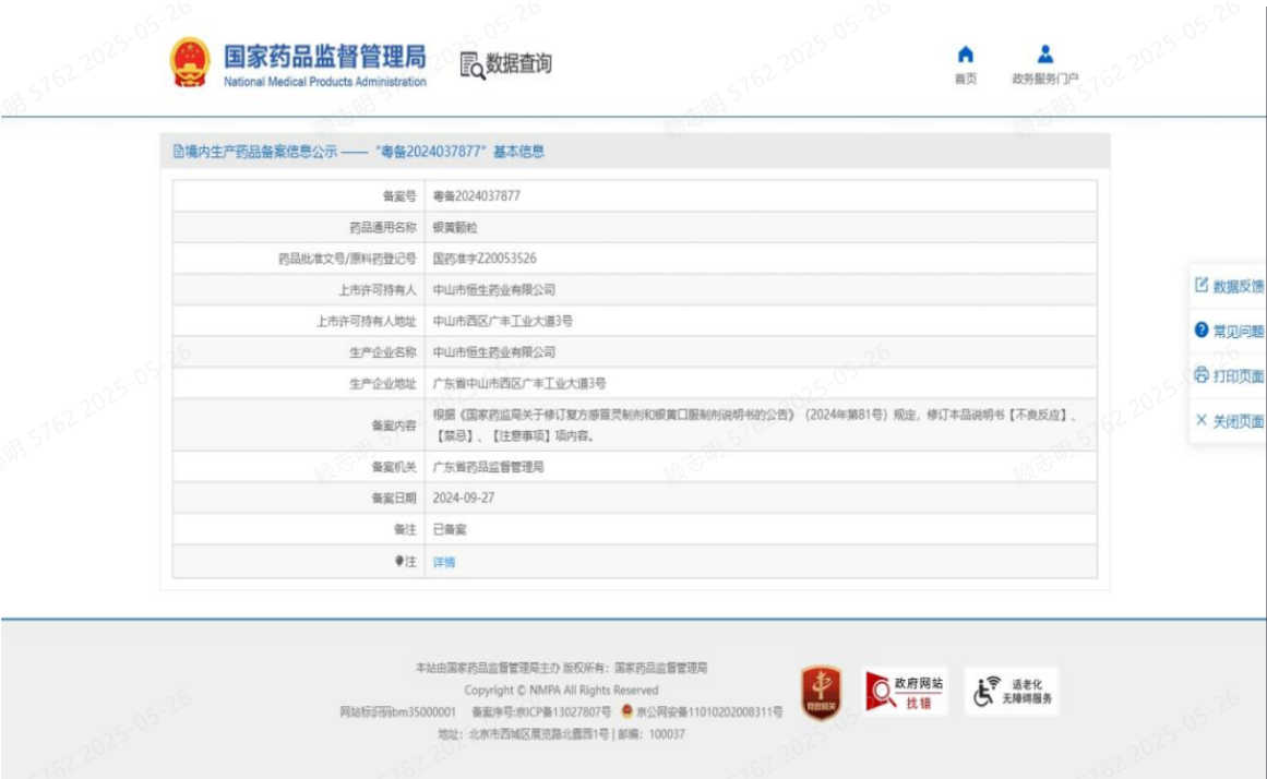 依據(jù)《國家藥監(jiān)局關(guān)于修訂復(fù)方感冒靈制劑和銀黃口服制劑說明書的公告(2024年第81號)》要求,我司已對銀黃顆粒(國藥準(zhǔn)字Z20053526)藥品說明書中【不良反應(yīng)】、【禁忌】、【注意事項】項進行了修訂,并于2024年9月27日通過廣東省藥品監(jiān)督管理局備案(備案號:粵備2024037877號,詳見附件1《備案證明》)。修訂后的說明書符合《藥品說明書和標(biāo)簽管理規(guī)定》(局令第24號)及現(xiàn)行法規(guī)要求。