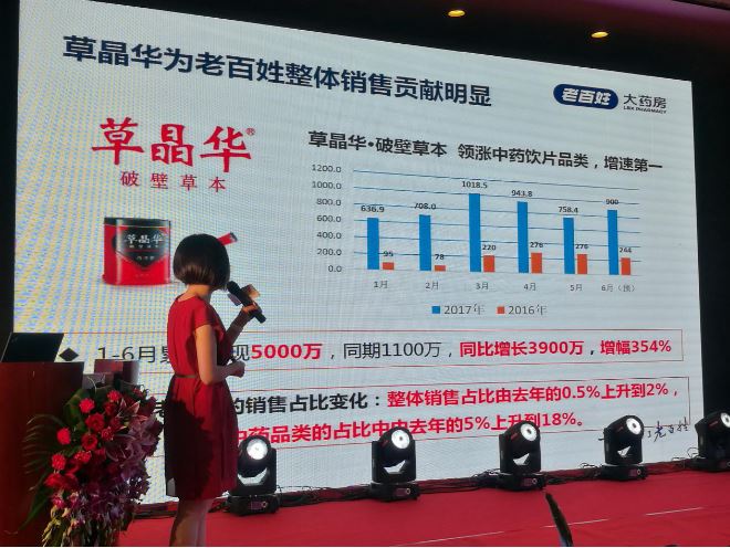 創(chuàng)新品類草晶華破壁草本已形成熱銷勢能。王黎用數(shù)據(jù)說話,她說:草晶華因其質(zhì)量優(yōu)勢、技術(shù)優(yōu)勢、運營優(yōu)勢,成為領(lǐng)漲中藥飲片品類增速第一的創(chuàng)新品類。2016年11月18日,老百姓大藥房執(zhí)行總裁馮硯祖率領(lǐng)高管團隊走進中智藥業(yè),與草晶華簽訂了2017年2億元的戰(zhàn)略合作,一起構(gòu)建共榮共生的渠道價值鏈。2017年草晶華破壁草本為老百姓整體銷售貢獻明顯,前6個月累計銷售增幅354%,事實證明,草晶華的熱銷勢能,在未來將越來越大。