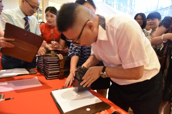 還記得排隊(duì)是為了什么嗎?謎底可以揭開了,原來——大家長出手送神秘禮品啦。且看一襲白衣、精神抖擻的大家長,雙手握一玉石大印,大有一印在手、天下我有之氣概。隨著隊(duì)伍前移,他手起印落,在牛皮封的筆記本上留下紅泥墨寶。這可是大家長的“墨寶”哦,四方大印刻下的大家長的名字,留存在時光中,溫暖人心。